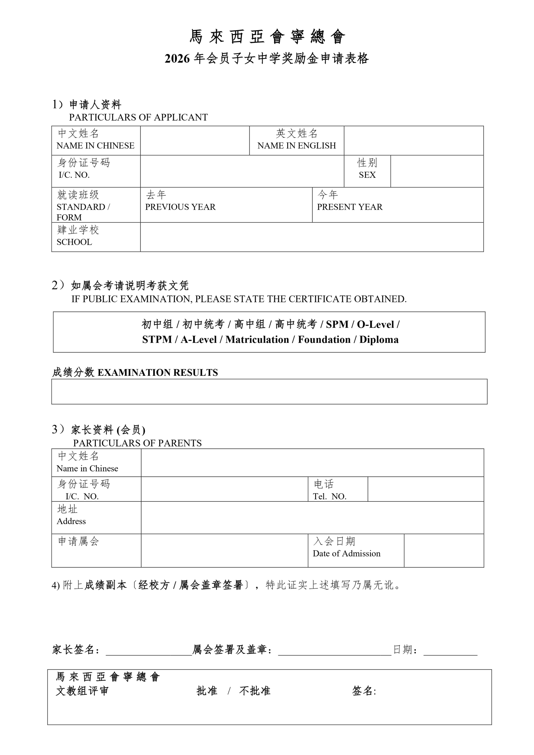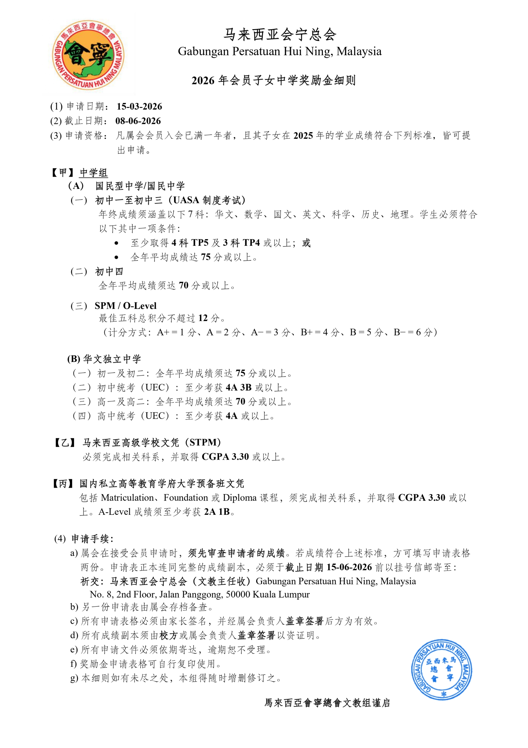 马来西亚会宁总会2026年度会员子女中学奖励金申请细则